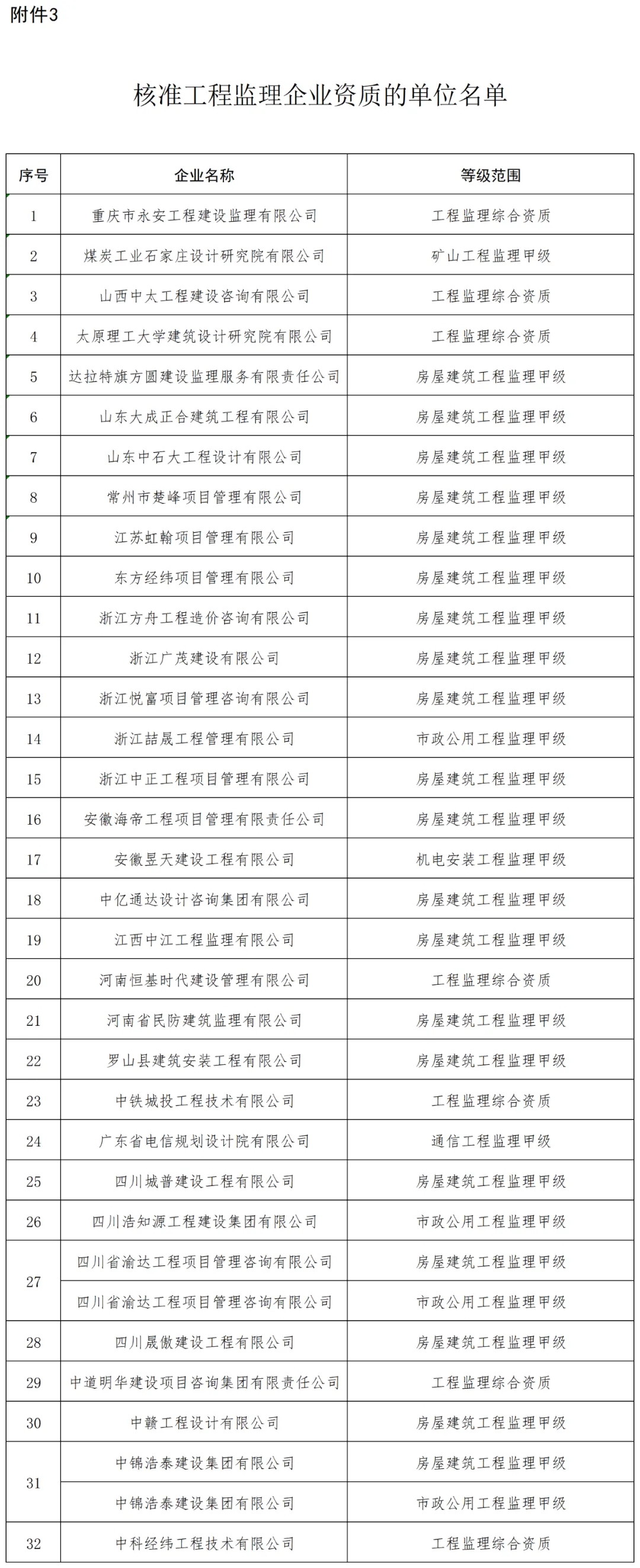 3.核准工程监理企业资质的单位名单